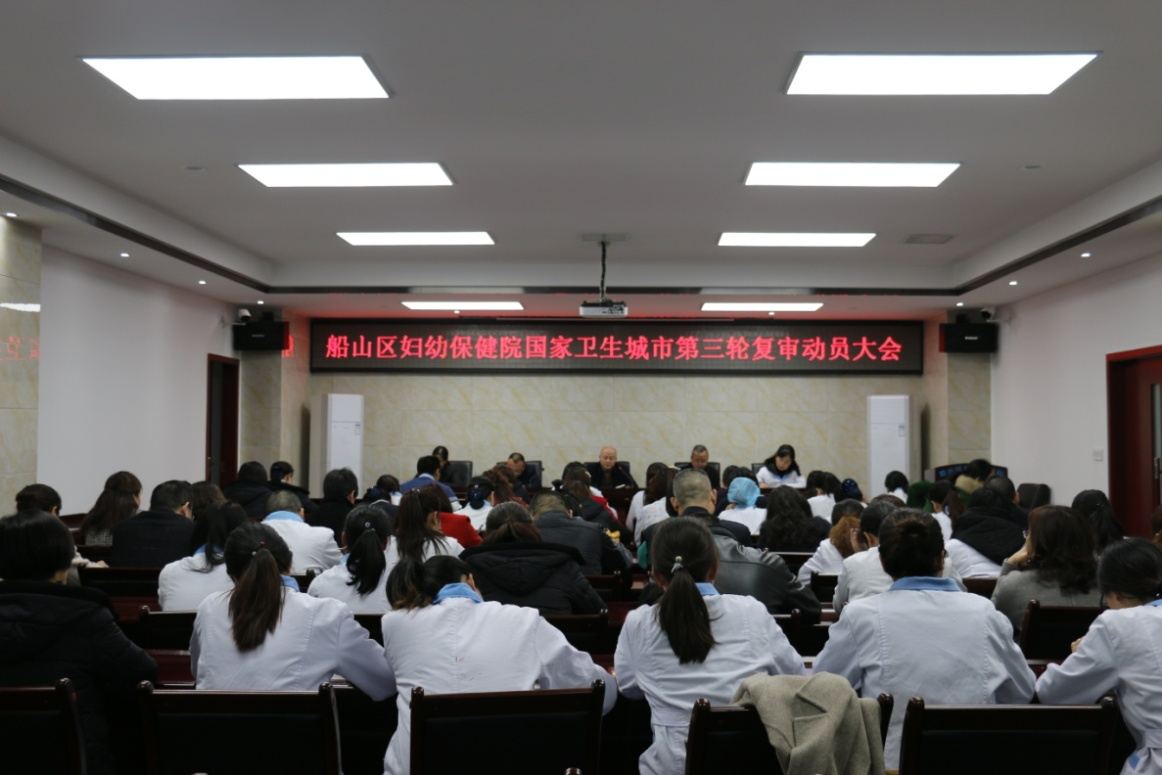 会上分管院长喻永兵根据文件精神就复审工作目标、实施步骤、工作重点、保障措施等进行了讲解?院长蒋晓海在会上做了重要讲话?一是及时传达了区政府组织召开的卫生城市复审会议精神;二是要求全院干部职工深刻认识国家卫生城市复审的重要意义;要强化组织领导,相互协作,强化考核督查,强化长效管理;三是要及时整改工作中存在的突出问题,要层层落实责任,把目标任务细化分解到每一个人,精心组织,扎实工作.确保按期完成各项工作任务?