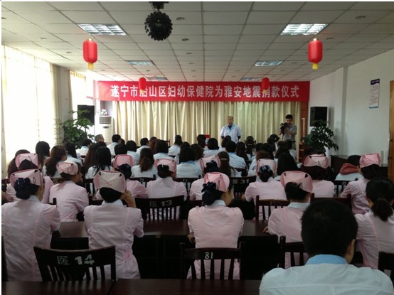 2013年4月20日上午8时2分,雅安芦山发生7.0级地震,这场突如其来的灾害,给灾区的同胞造成了巨大的经济损失和精神创伤。 我院在上级红十字会的号召下,由医院党支部和工会组织,于2013年5月2日上午8时20分在七楼会议室举行捐款活动。蒋院长带头捐款500元,全院干部职工积极响应,总共筹得捐款资金9550元整。 大家表示:虽然这些捐款对于灾区人民的损失来说是微不足道,但是这代表了我们对同胞的一份心意,也是作为医务工作者应有的人道主义精神和应尽的社会责任,希望灾区人民能早日度过难关,重建家园。
